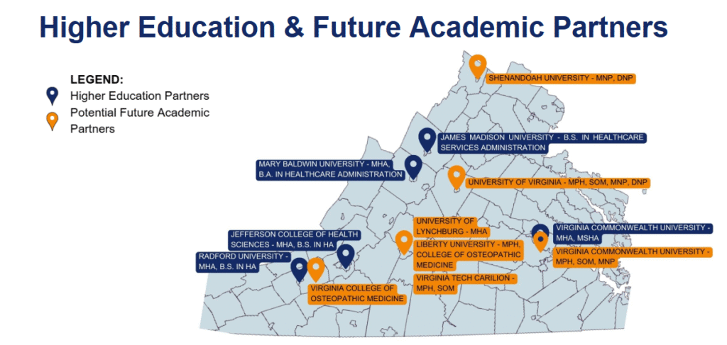- Radford University Carilion / Jefferson College of Health Sciences – MHA, B.S. in Healthcare Administration